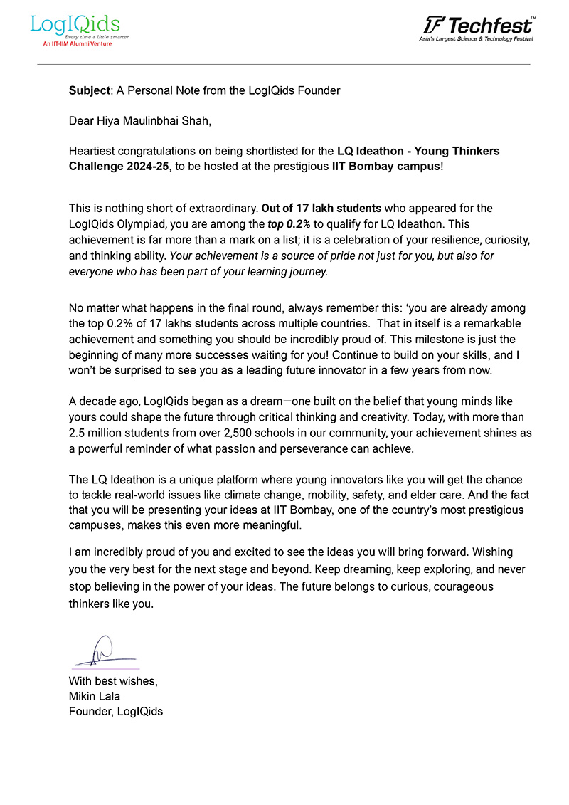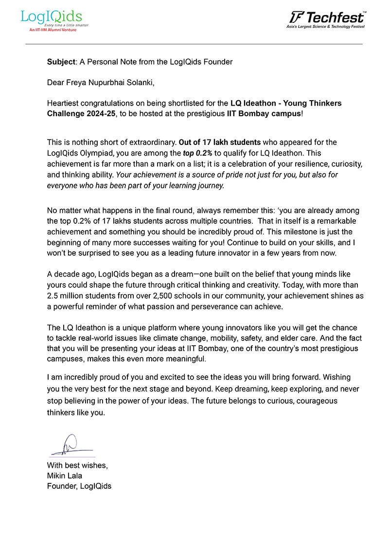 We are thrilled to inform you that, students from our school have been shortlisted for the LQ Ideathon – Young Thinkers Challenge, an initiative by LogiQids in collaboration with Techfest, IIT Bombay.